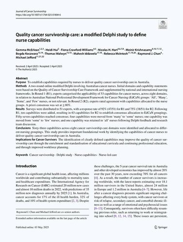 The Clinical Oncology Society of Australia (COSA) Survivorship Group, led by COSA Survivorship Fellow and CNSA Vice President Prof Gemma McErlean, has recently published work on identifying the capabilities of cancer nurses to deliver quality cancer survivorship care in Australia, aiming to improve the quality of cancer care.