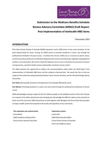 CNSA participated in the 2023 Medicare Benefits Schedule Review Advisory Committee (MRAC) consultation and raised serious concerns about the potential impacts of these telehealth changes on people affected by cancer, particularly those in rural and regional areas.